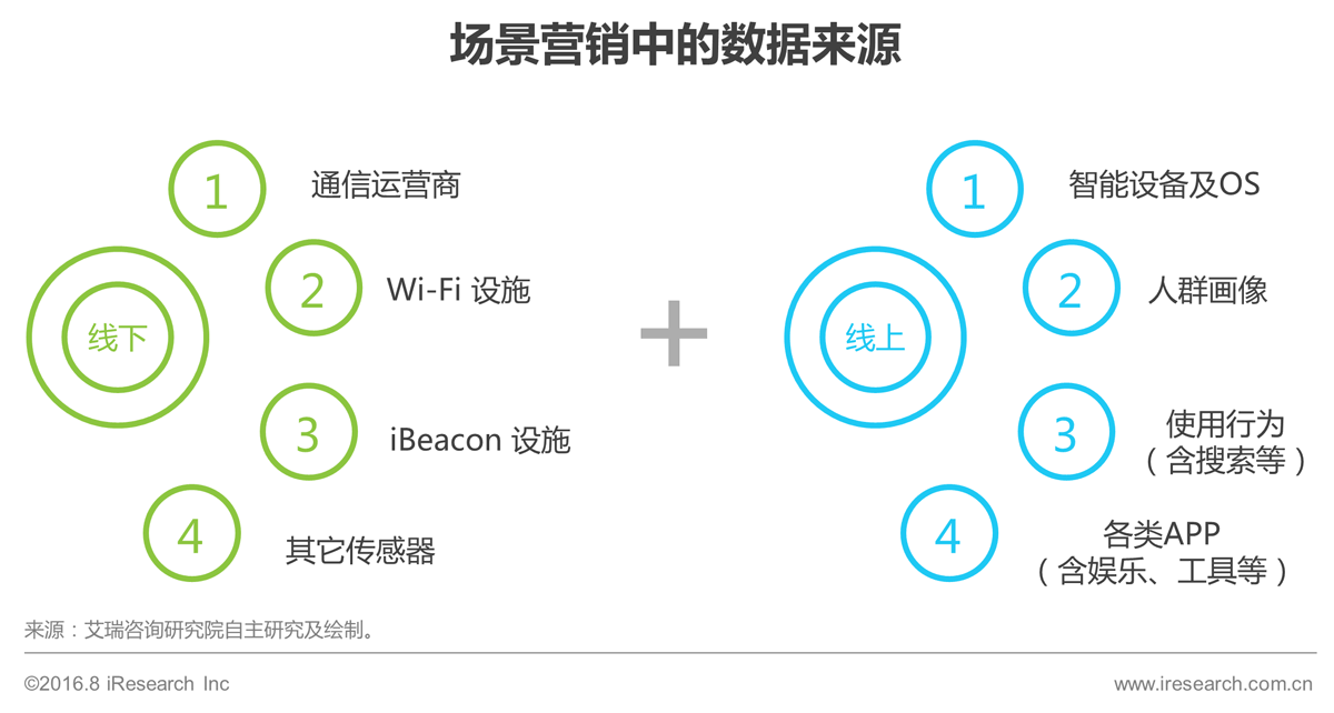 场景营销中实现广告的精准场景化投放,很大程度上依赖于数据的真实、多维以及结构化。相较于传统网络营销,场景营销中数据来源更为丰富,可分为两大类别:1)线下来源,如通信运营商、Wi-Fi设施、iBeacon设施和其它传感器等;2)线上来源,如智能设备、智能OS、人群画像、使用行为和各类APP等。