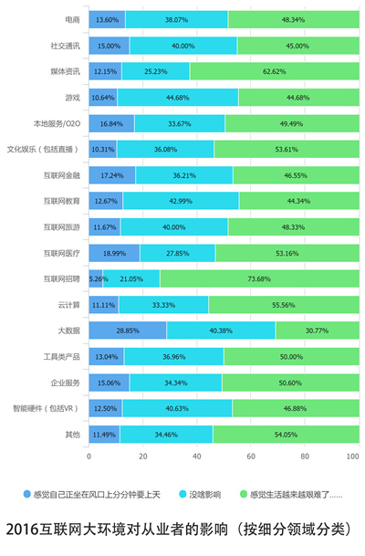 杭州的小伙伴对待互联网大环境态度最乐观。1/4的杭州互联网人“感觉自己正坐在风口上分分钟要上天”。而在同项调查中,只有11%的北京互联网人表达了同样的看法,是各大城市中比例最低的。