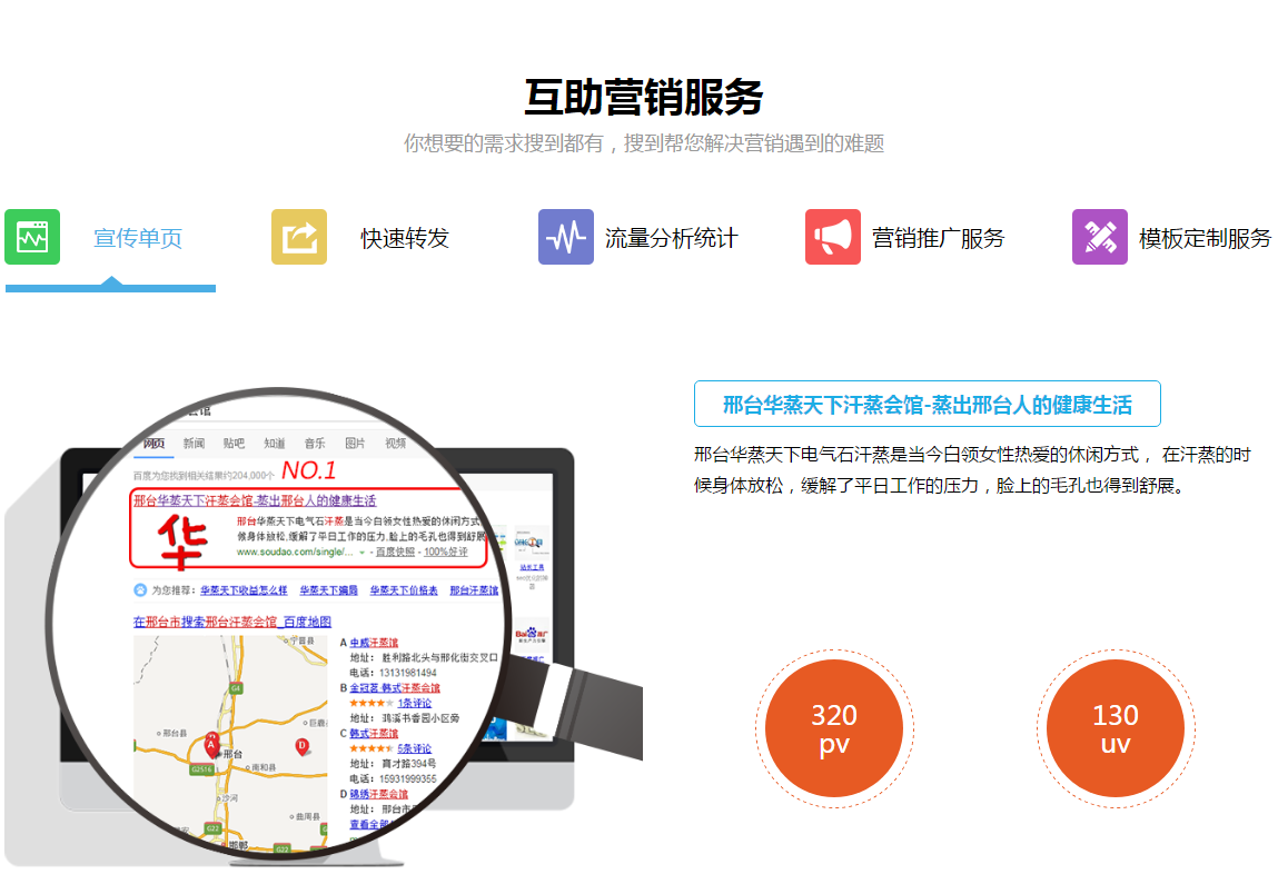 “搜到网”营销模板不同于传统网页模板,它是基于某一类产品或某一种服务进行的引导式创意设计而来的,我们的营销模板就是一个营销策划方案,是设计师通过设计手法将产品或服务合理的展现出来,便于引导用户进行数据的持续创建、持续传播。