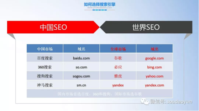 如果你的目标客户在中国,百度搜索引擎,百度占中国搜索引擎70%左至份额,如果你的客户在国际市场,谷歌(google)搜索引擎。谷歌占全球市场95%。