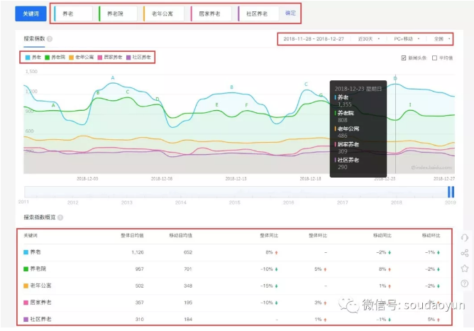 注意:关键词竞争力指数高,并不代表客户转化就大。必须要通过词义、用户习惯、关键词指数、客户年龄进行综合分析。例如客户搜索“养老”这个词,就代表了一个很泛的需求,有可能需要养老服务,有可能想了解养老产业,也有可能学习养老模式。那么"养老院价格"和"养老院收费标准"就不同了,他的词意很明确。客户想了解养老院的收费情况。这种词往往目的性更强烈,转化率更高。